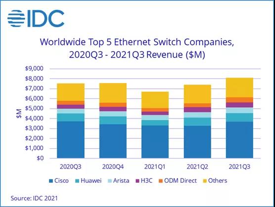 据IDC报告显示,2021 年第三季度全球以太网交换机市场收入为81 亿美元,同比增长 7.5%。全球企业和服务提供商 (SP) 路由器市场收入38 亿美元,同比增长4.7%。