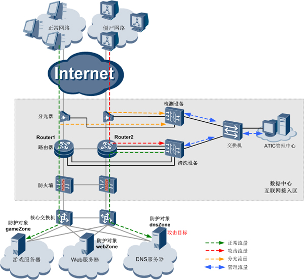 数据中心(Internet Data Center,简称IDC)是网络基础资源的一部分,为互联网内容提供商、企业、媒体和各类网站提供大规模、高质量、安全可靠的数据传输服务和高速接入服务。数据中心主要提供DNS服务器、Web服务器、游戏等业务。近年来,来自外部互联网针对数据中心的DDoS攻击越来越多,包括重要用户服务器遭受攻击,数据中心链路带宽被占用,以及视频、游戏、网游等业务遭受的应用层攻击。